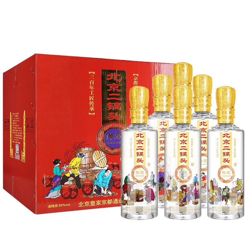 京都北京二锅头 传承 清香型 粮食高度 白酒 52度 优级酒 580ml*6瓶整箱