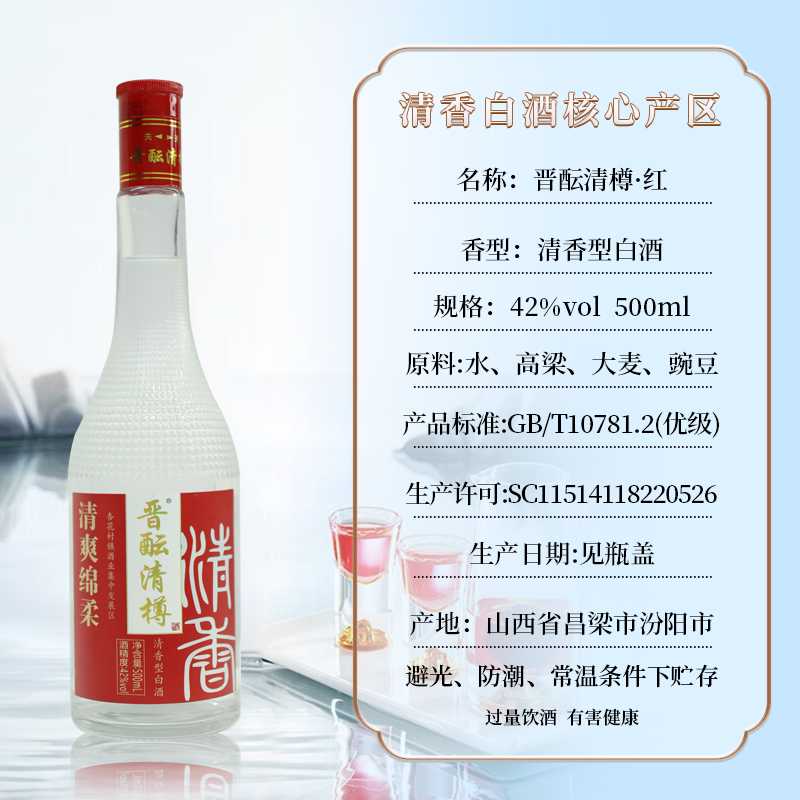 山西杏花村 杏铭泉 晋酝清樽红 清香型白酒 42度 500ml*6瓶 整箱