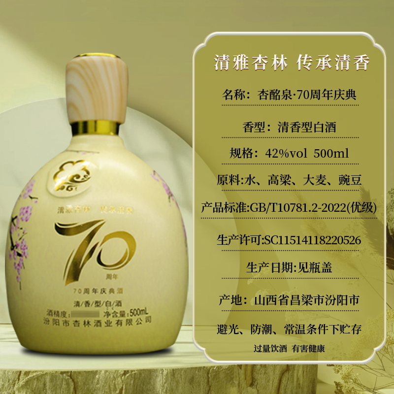 山西杏花村 杏铭泉 70周年庆典 清香型白酒 42度 500ml*6瓶 整箱