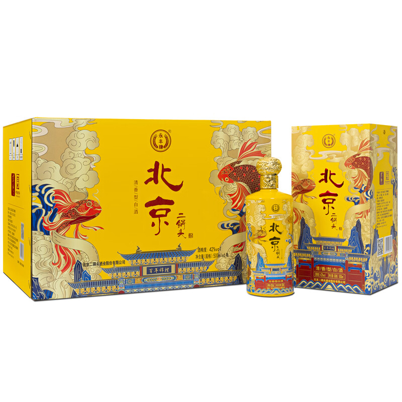 永丰牌 北京二锅头百年锦鲤 黄 42度 清香型固态法纯粮食酒礼盒装白酒 送礼 500mL*6瓶 整箱装